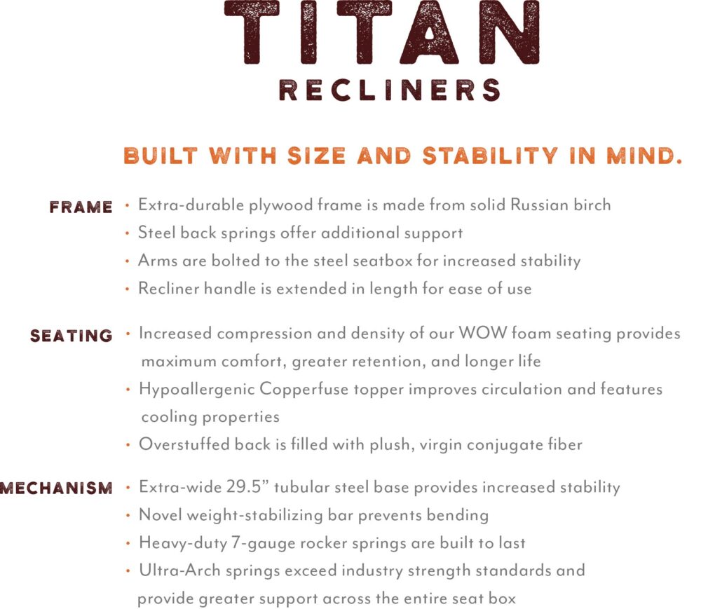 Experience ultimate comfort with the Caesar Westview Slate Titan Rocker Recliner. Measuring 49 inches in height, this recliner boasts a 24-inch seat width and fully reclines to the length of a king-sized bed. Enjoy maximum comfort with the re-engineered Mark Thomas Ultra-Arch, 5-inch WOW foam seating, and 2 inches of Copperfuse foam.