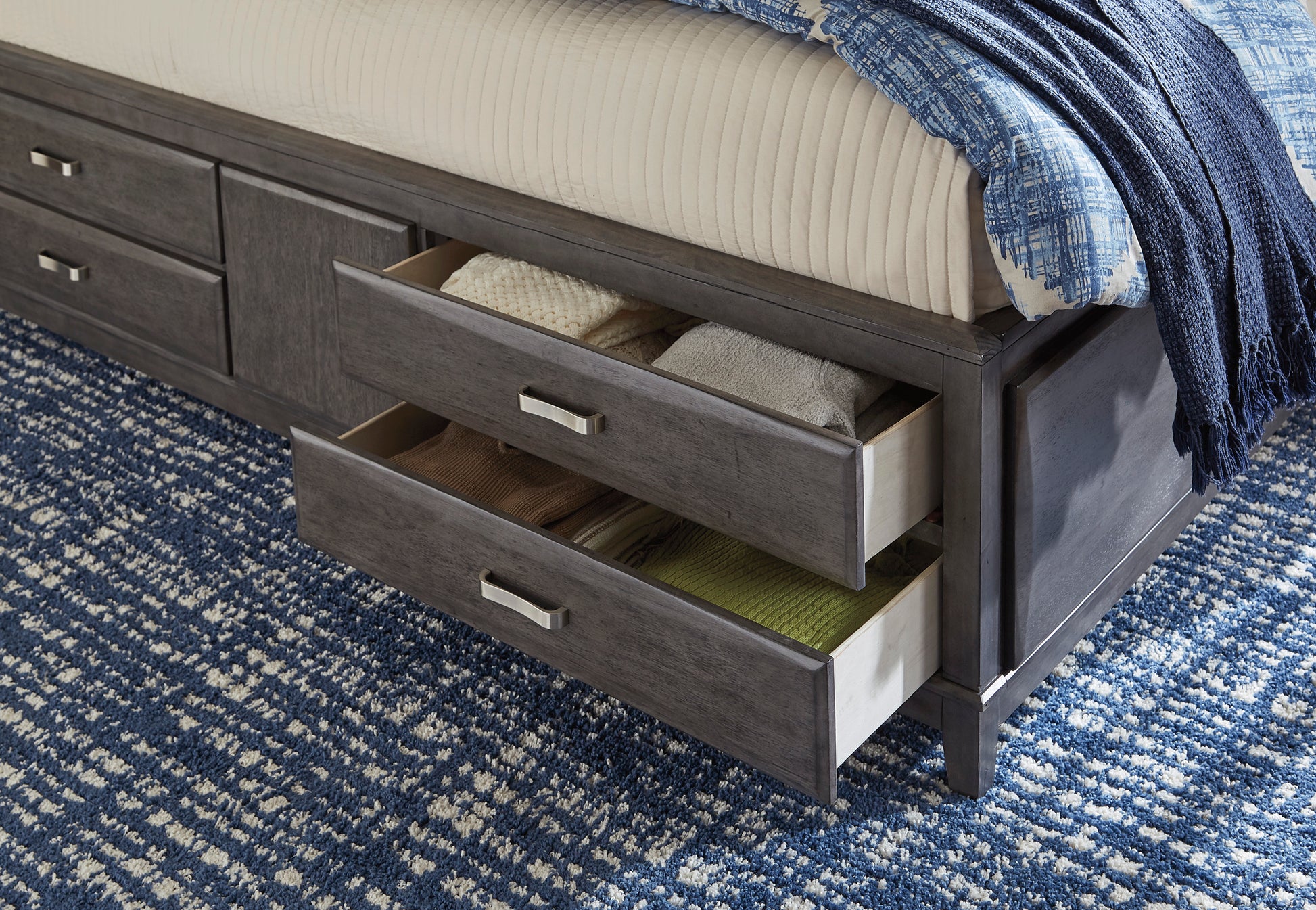 Contemporary style is taking shape in stunning fashion with this king storage bed. Designer touches shine from every angle, and its quality dovetail construction ensures lasting durability. Contoured drawers on each side offer smart storage solutions, perfect for extra bedding, pillows, or seasonal clothes. With additional storage at the head and foot of the bed, you'll have everything covered from top to bottom.
